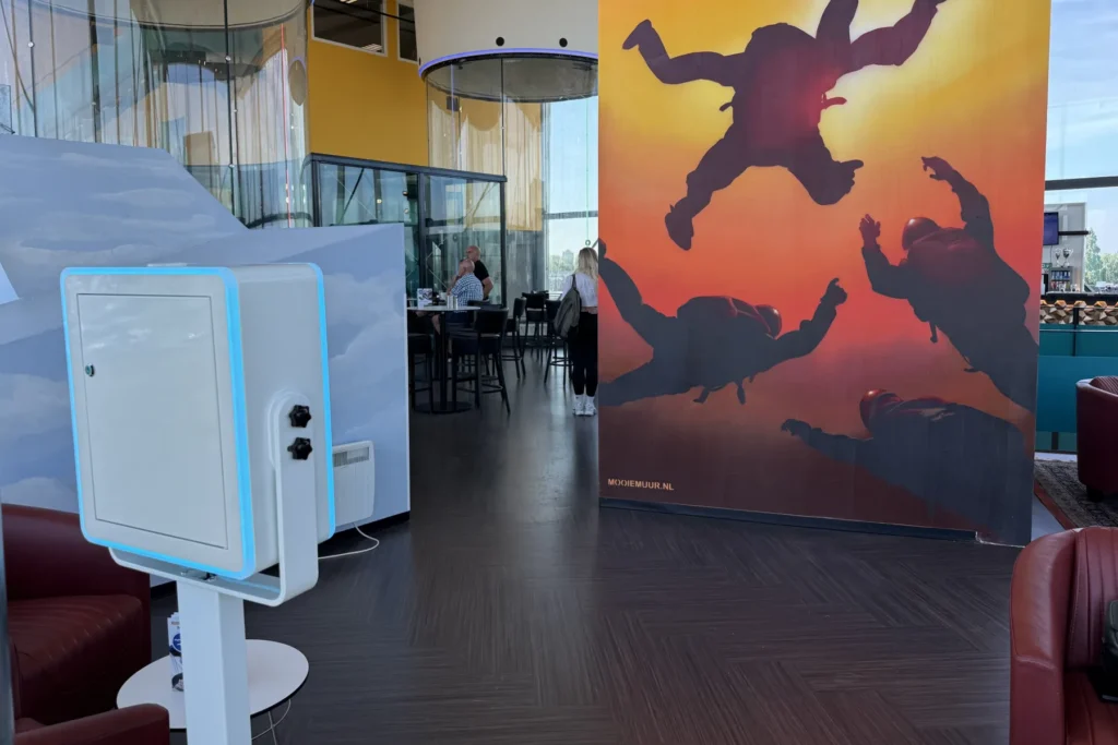 Die Fotobox ist strategisch direkt vor dem Windkanal platziert. Sie wird täglich von Besuchern genutzt. Jedes Foto enthält das City Skydive-Logo und wird direkt an den Posteingang des Gastes gesendet – oft geteilt oder gespeichert. Es ist ein permanentes Sichtbarkeits-Tool, das kein Personal erfordert und völlig autonom läuft. An das Stromnetz angeschlossen, startet es automatisch.